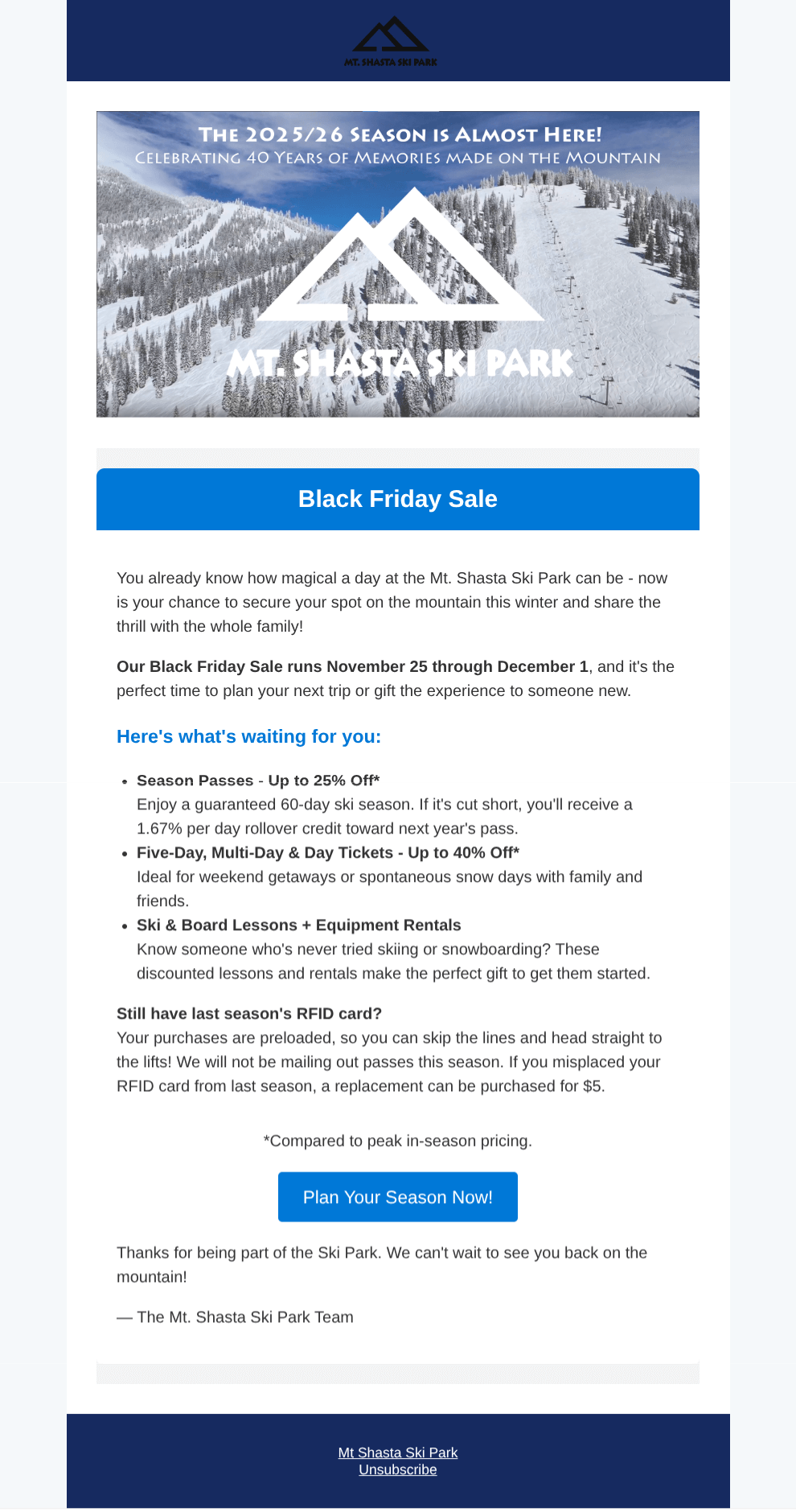 Mt Shasta’s creative Black Friday season pass sales concept.
