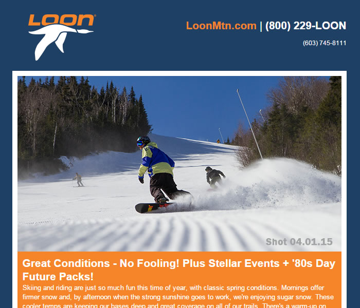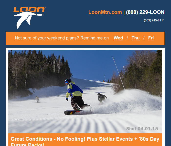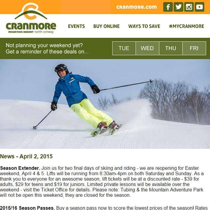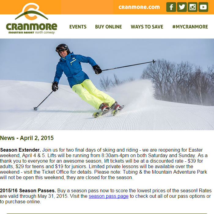 As I often do, I’ll start with a couple nicely-designed templates from two New Hampshire resorts I enjoy following. I’ll put their subject lines above the screenshot as both reference the upcoming weekend.
